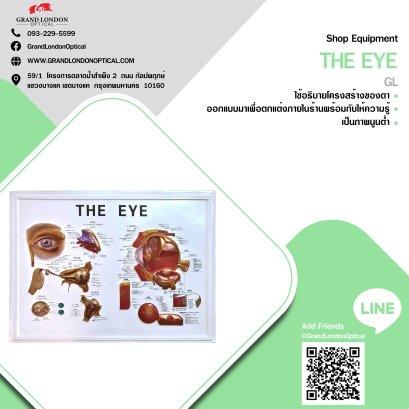 แผ่นโปสเตอร์กายวิภาคดวงตา “THE EYE” จาก GRAND LONDON OPTICAL ใช้สำหรับตกแต่งร้านแว่นและให้ความรู้ด้านโครงสร้างดวงตา ช่วยสร้างบรรยากาศมืออาชีพ เหมาะสำหรับคลินิกสายตา ร้านแว่น และศูนย์ตรวจสายตา พร้อมบริการติดต่อสะดวกผ่าน LINE และช่องทางออนไลน์