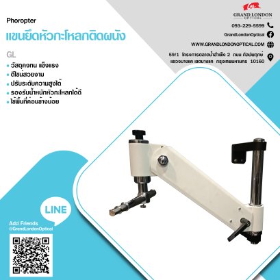 แขนยึดหัวกะโหลกติดผนังสำหรับเครื่องวัดสายตา (Phoropter): เป็นอุปกรณ์ที่ใช้ในร้านแว่นตาและคลินิกสายตา ใช้สำหรับยึดเครื่องวัดสายตา (Phoropter) ติดกับผนัง