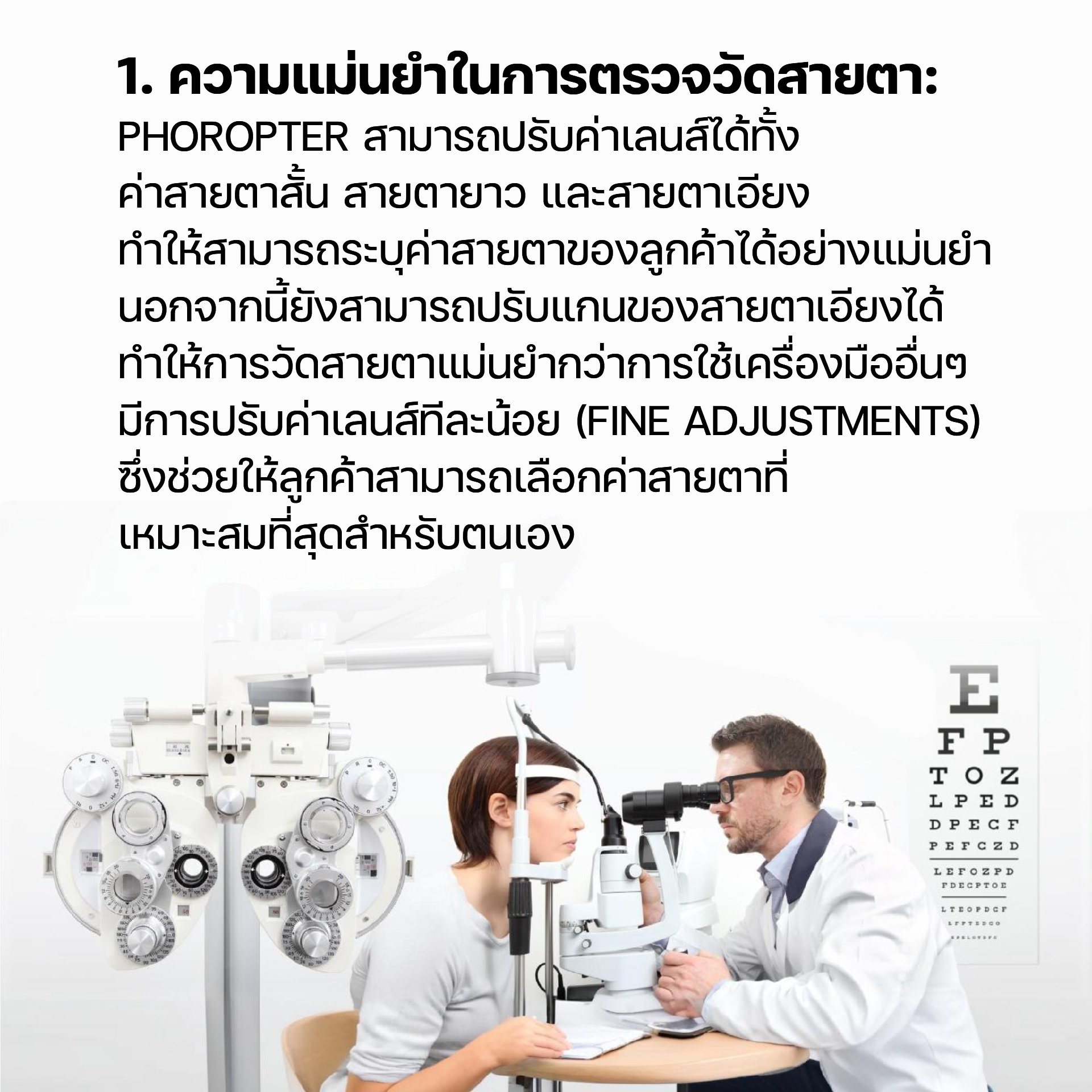 เครื่อง Phoropter สามารถใช้ตรวจวัดสายตาทั้งระยะใกล้และระยะไกล รวมถึงการตรวจภาวะสายตายาวตามอายุ (Presbyopia) และการทำงานร่วมกันของดวงตาทั้งสองข้าง (Binocular Vision) ทำให้ผู้ตรวจสามารถประเมินและแก้ไขปัญหาสายตาได้ครอบคลุมมากขึ้น